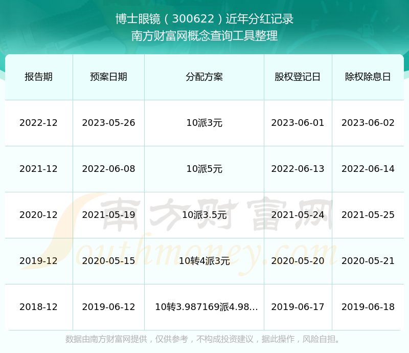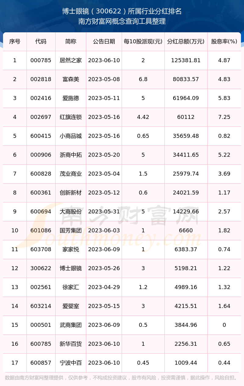 按照南方财富网趋势选股系统统计,博士眼镜所属行业为眼镜行业,眼镜行业分红排名情况如下表: