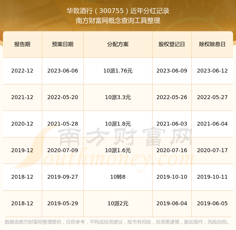 华致酒行最新一次公布的分红方案为10派1.76元。本次权益分派股权登记日为2023年6月9日,除权除息日为2023年6月12日,派息日为2023年6月12日。