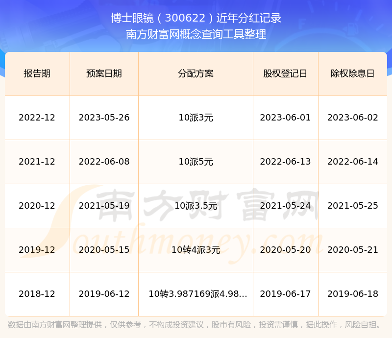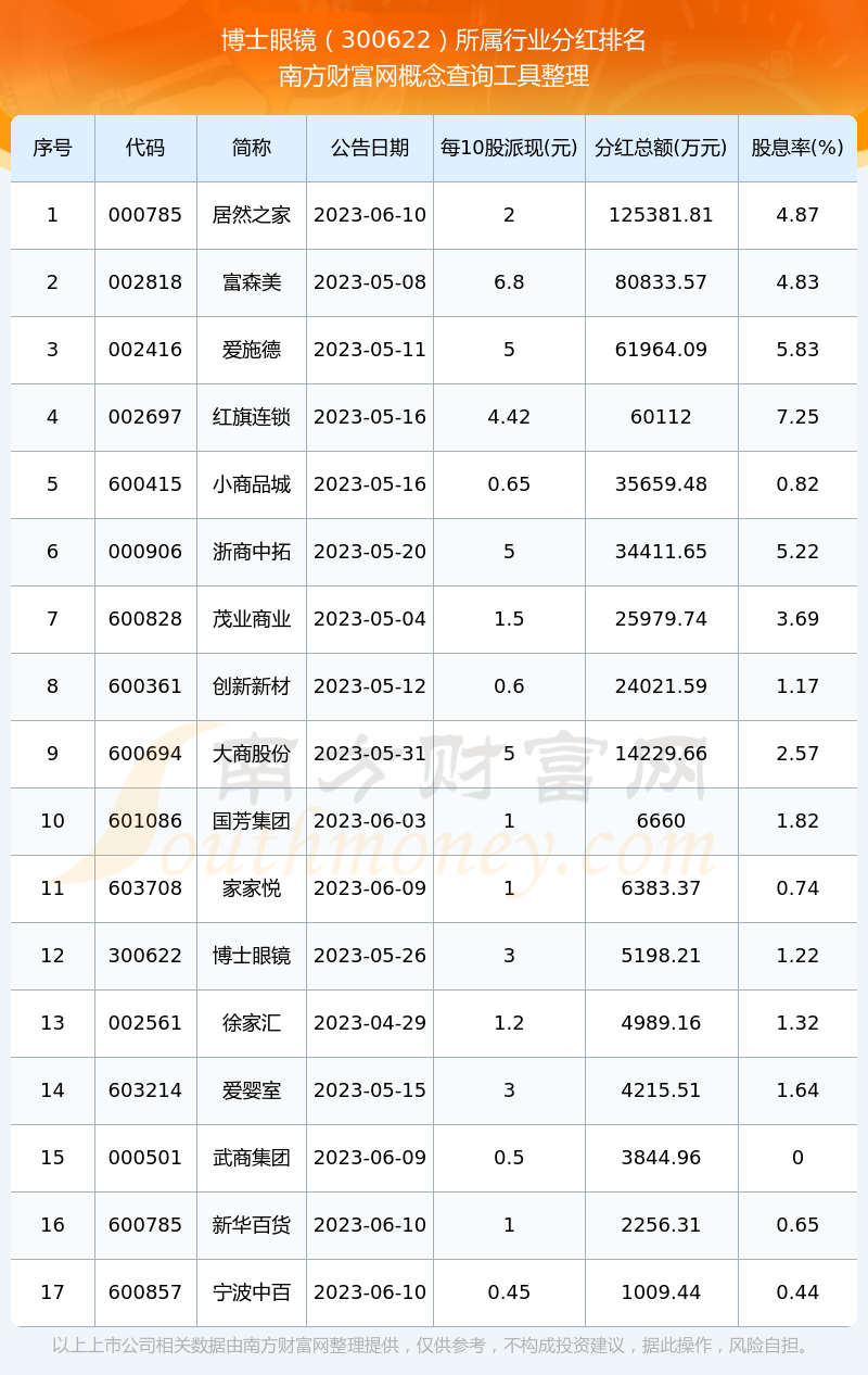 按照南方财富网趋势选股系统统计,博士眼镜所属行业为眼镜行业,眼镜行业分红排名情况如下表: