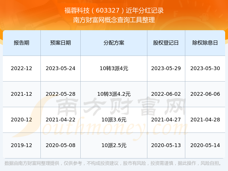 福蓉科技最新一次公布的分红方案为10转3派4元。本次权益分派股权登记日为2023年5月29日,除权除息日为2023年5月30日,派息日为2023年5月30日。