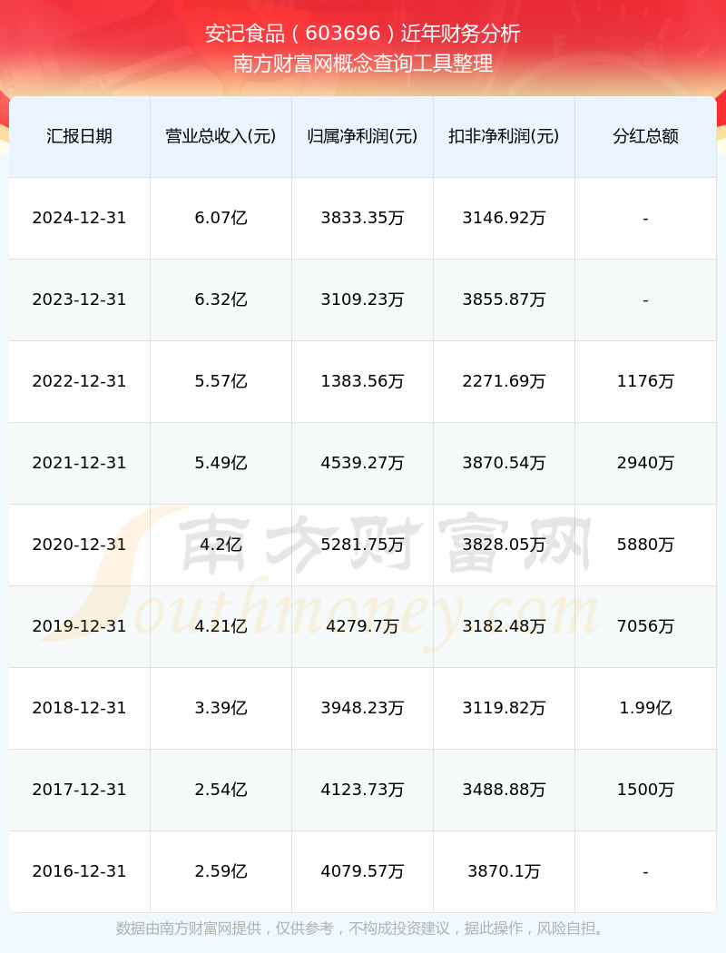 安记食品公司2024年实现营业收入6.07亿元,同比增长-4.06%;净利润3833.35万元,同比增长23.29%;毛利率16.15%。