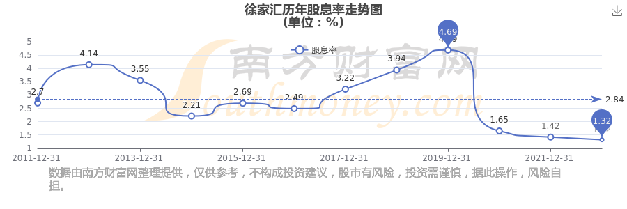 徐家汇最新一次公布的分红方案为10派1.2元。本次权益分派股权登记日为2023年5月10日,除权除息日为2023年5月11日,派息日为2023年5月11日。