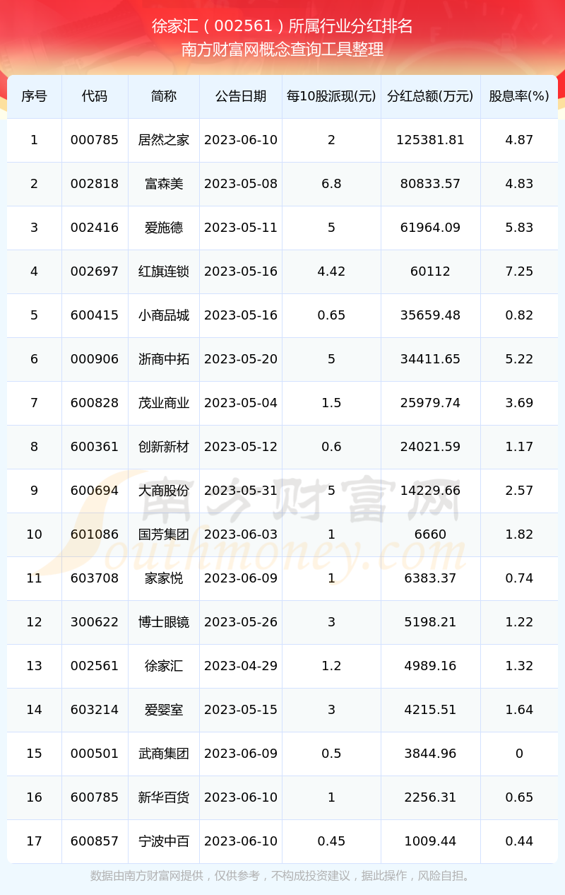 按照南方财富网趋势选股系统统计,徐家汇所属行业为商业百货行业,商业百货行业分红排名情况如下表: