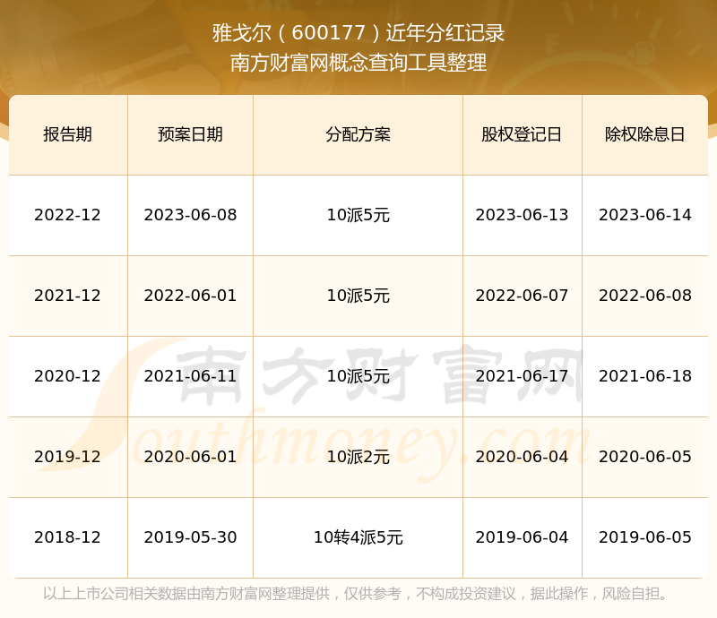 雅戈尔最新一次公布的分红方案为10派5元。本次权益分派股权登记日为2023年6月13日,除权除息日为2023年6月14日,派息日为2023年6月14日。
