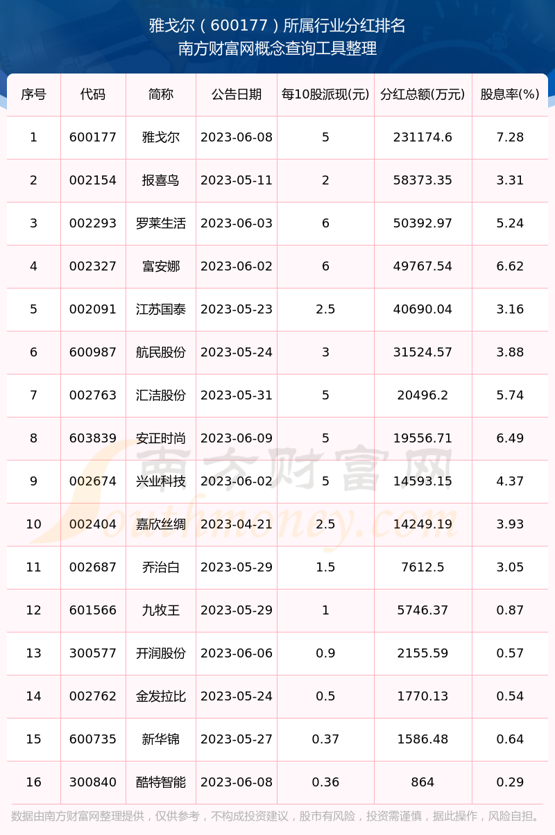 按照南方财富网趋势选股系统统计,雅戈尔所属行业为纺织服装行业,纺织服装行业分红排名情况如下表: