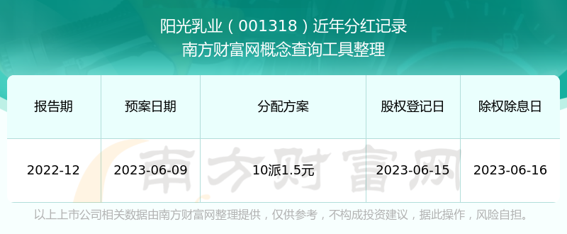 阳光乳业最新一次公布的分红方案为10派1.5元。本次权益分派股权登记日为2023年6月15日,除权除息日为2023年6月16日,派息日为2023年6月16日。
