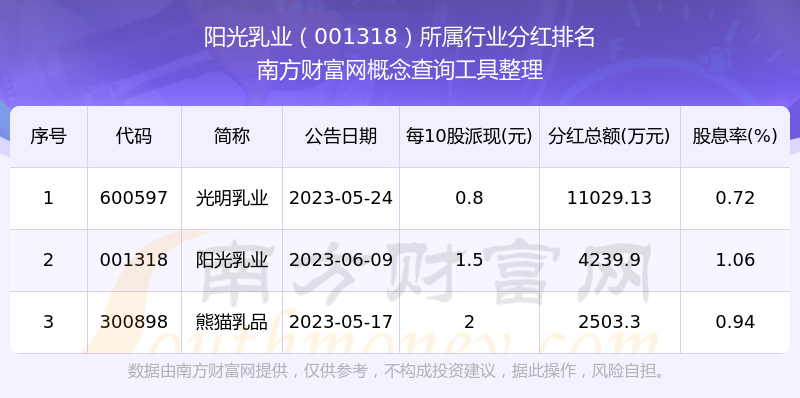 按照南方财富网趋势选股系统统计,阳光乳业所属行业为乳制品行业,乳制品行业分红排名情况如下表: