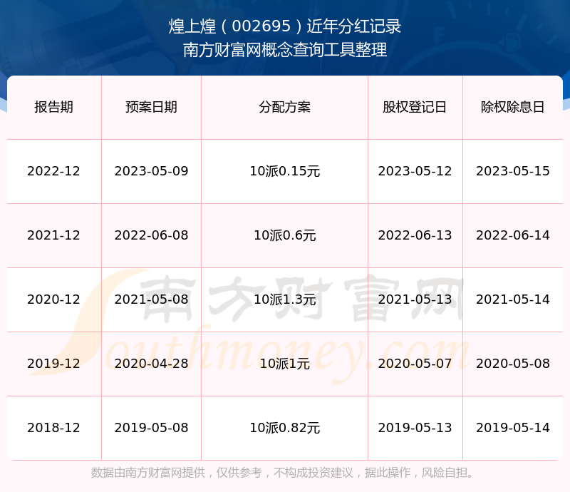 煌上煌最新一次公布的分红方案为10派0.15元。本次权益分派股权登记日为2023年5月12日,除权除息日为2023年5月15日,派息日为2023年5月15日。