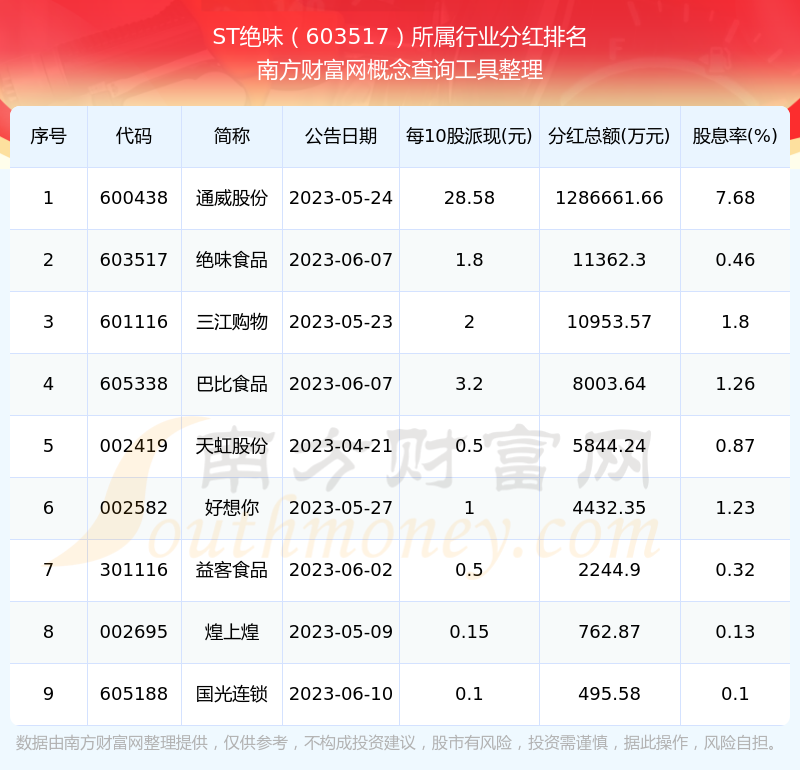 按照南方财富网趋势选股系统统计,ST绝味所属行业为食品行业,食品行业分红排名情况如下表: