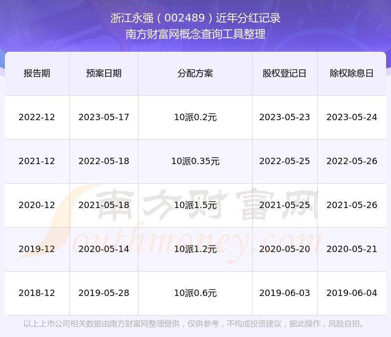 浙江永强最新一次公布的分红方案为10派0.2元。本次权益分派股权登记日为2023年5月23日,除权除息日为2023年5月24日,派息日为2023年5月24日。