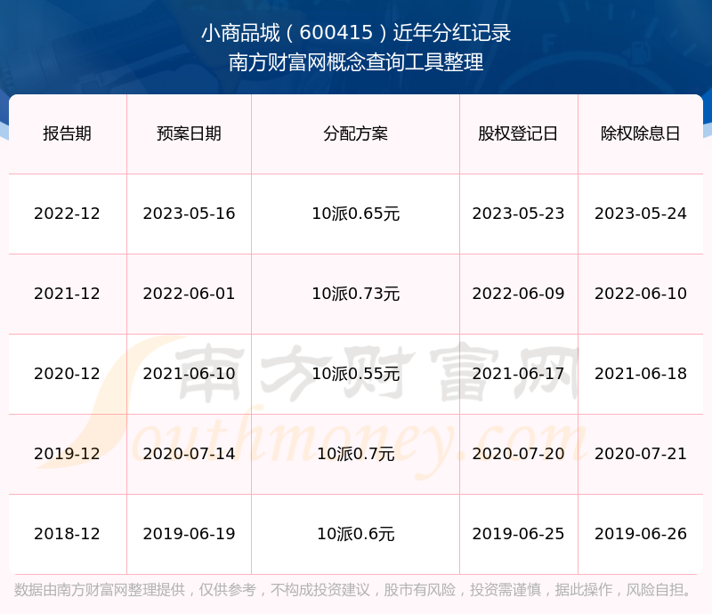 小商品城最新一次公布的分红方案为10派0.65元。本次权益分派股权登记日为2023年5月23日,除权除息日为2023年5月24日,派息日为2023年5月24日。