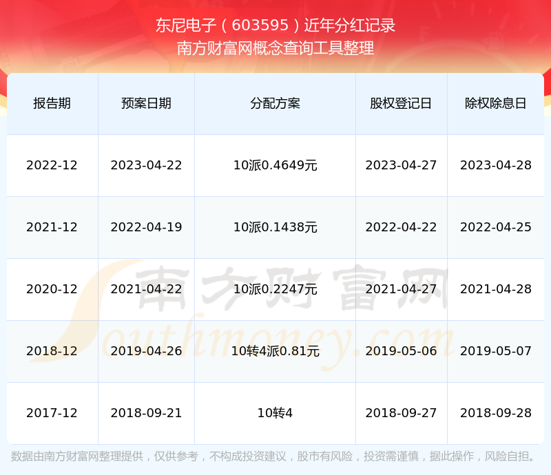 东尼电子最新一次公布的分红方案为10派0.4649元。本次权益分派股权登记日为2023年4月27日,除权除息日为2023年4月28日,派息日为2023年4月28日。