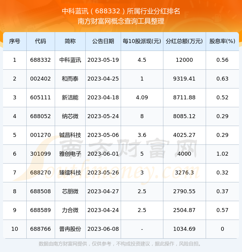 按照南方财富网趋势选股系统统计,中科蓝讯所属行业为芯片行业,芯片行业分红排名情况如下表: