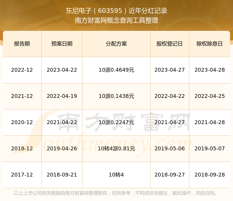东尼电子最新一次公布的分红方案为10派0.4649元。本次权益分派股权登记日为2023年4月27日,除权除息日为2023年4月28日,派息日为2023年4月28日。