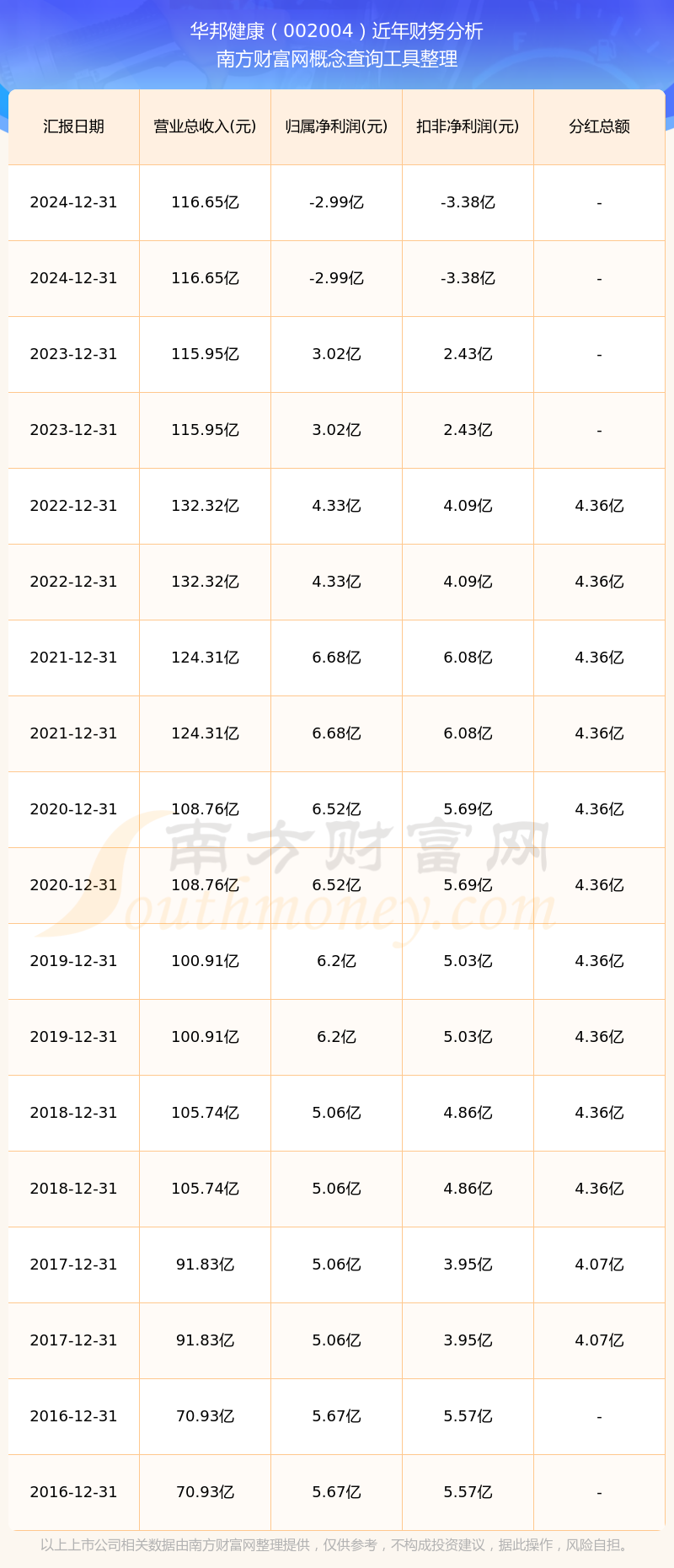 华邦健康历年分红派息情况如下表所示:
