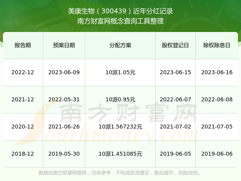 美康生物最新一次公布的分红方案为10派1.05元。本次权益分派股权登记日为2023年6月15日,除权除息日为2023年6月16日,派息日为2023年6月16日。