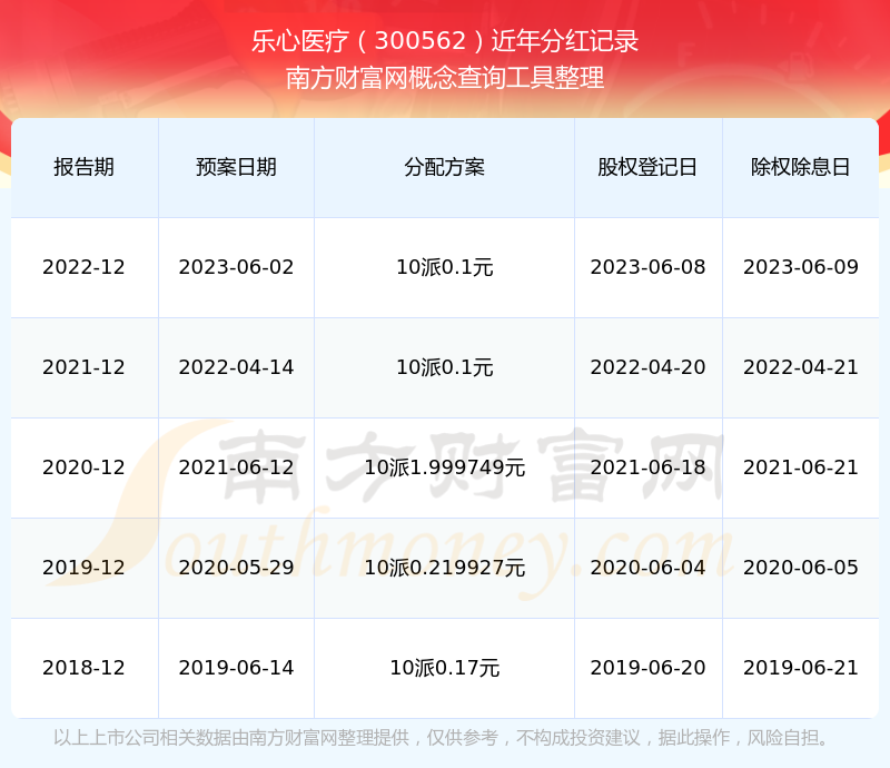 乐心医疗最新一次公布的分红方案为10派0.1元。本次权益分派股权登记日为2023年6月8日,除权除息日为2023年6月9日,派息日为2023年6月9日。