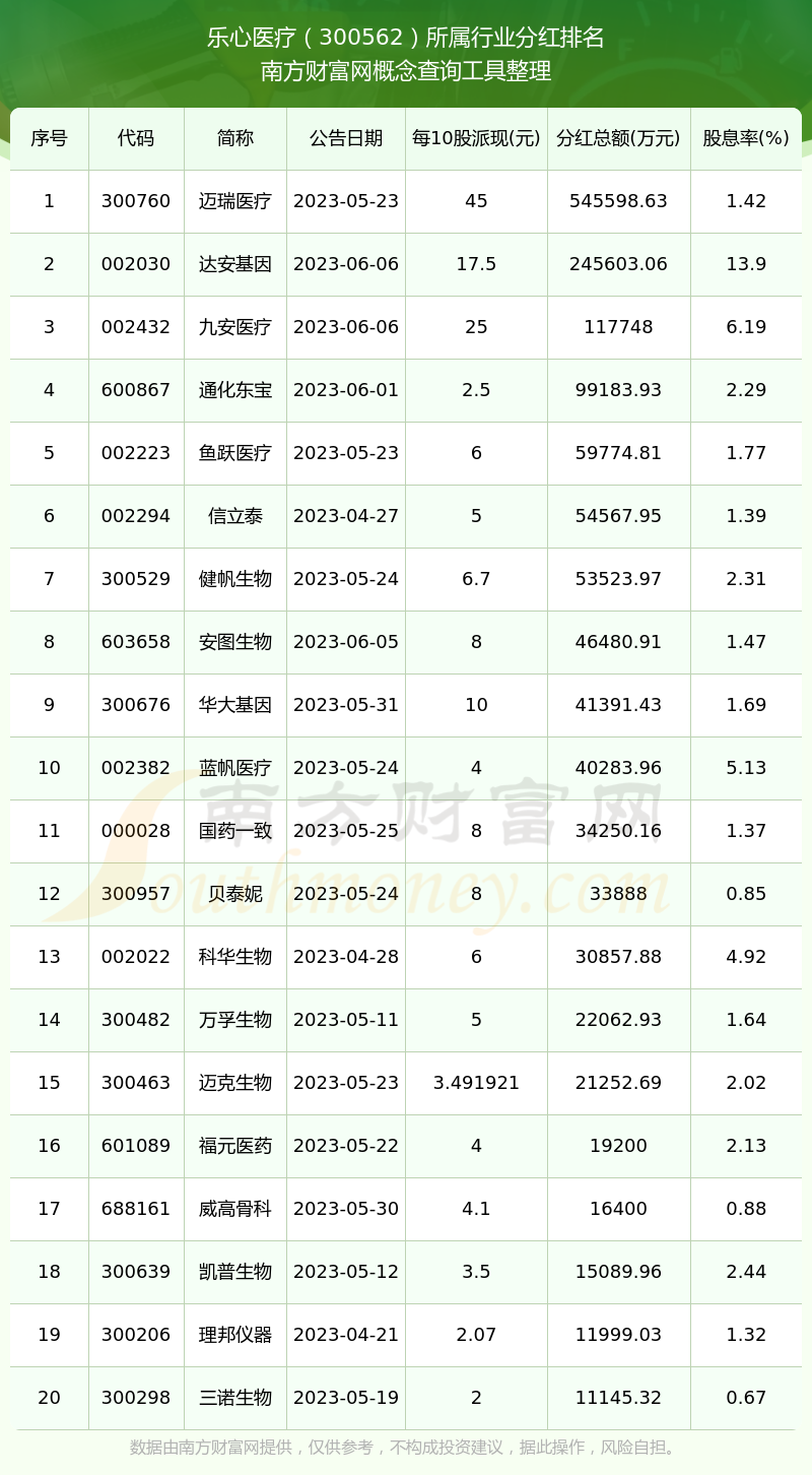 按照南方财富网趋势选股系统统计,乐心医疗所属行业为医疗器械行业,医疗器械行业分红排名情况如下表: