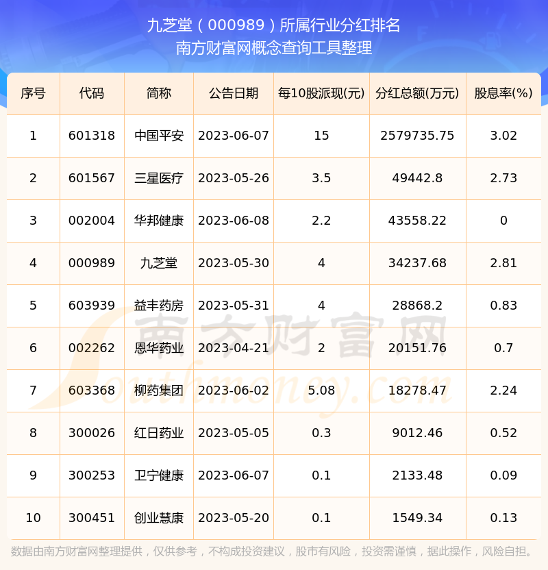 按照南方财富网趋势选股系统统计,九芝堂所属行业为中成药行业,中成药行业分红排名情况如下表: