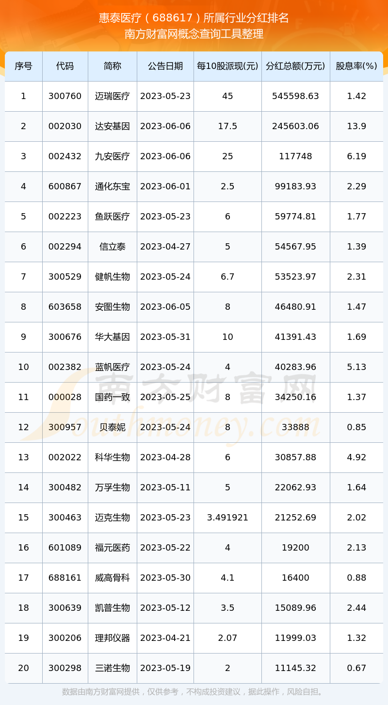 按照南方财富网趋势选股系统统计,惠泰医疗所属行业为医疗器械行业,医疗器械行业分红排名情况如下表: