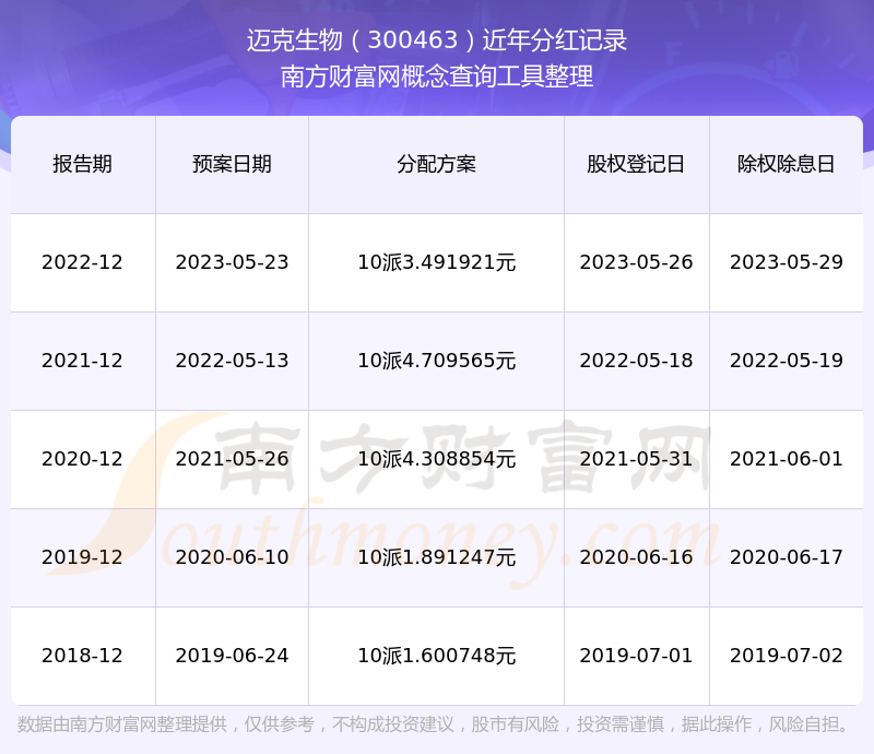 迈克生物最新一次公布的分红方案:10派3.491921元。