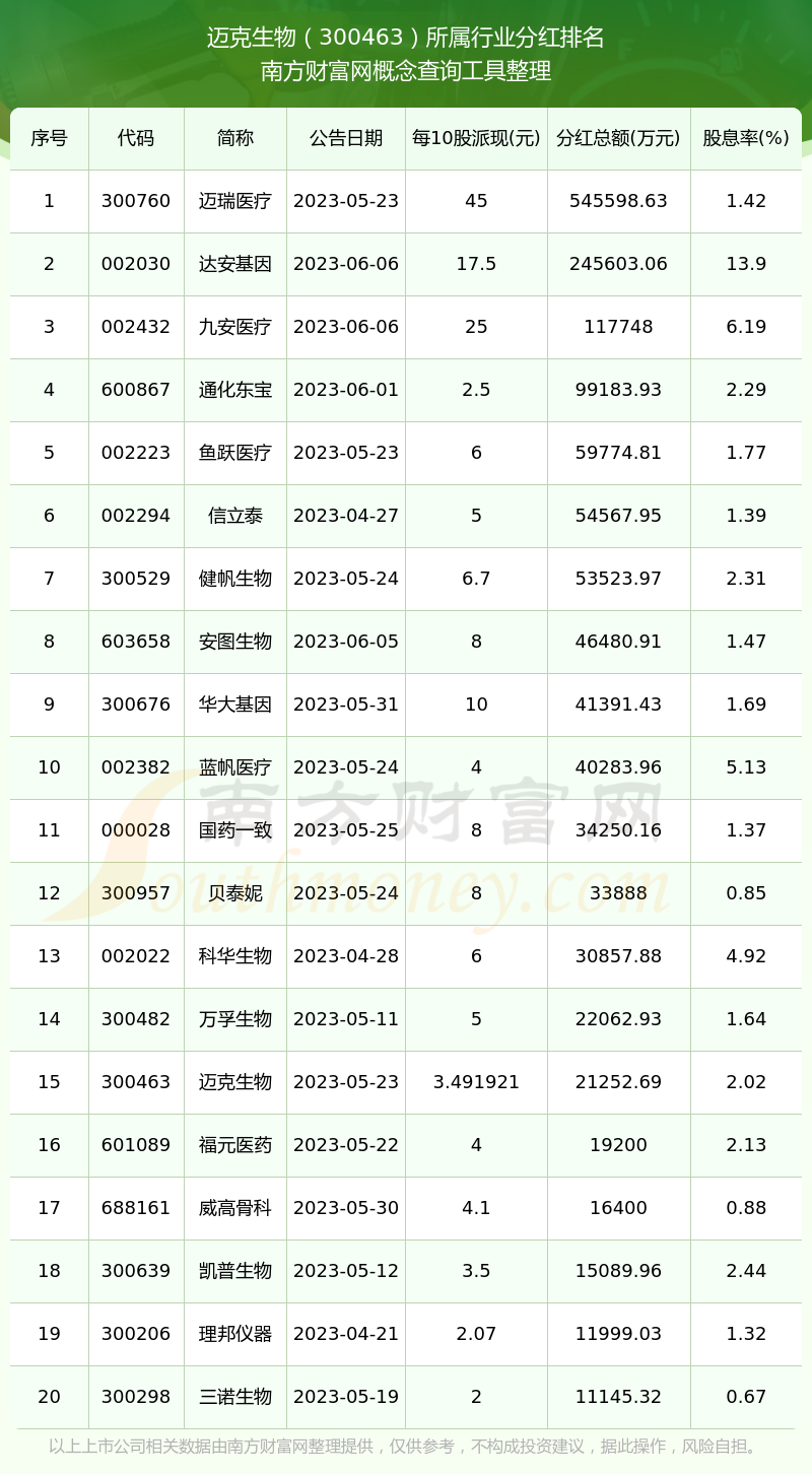按照南方财富网趋势选股系统统计,迈克生物所属行业为医疗器械行业,医疗器械行业分红排名情况如下表: