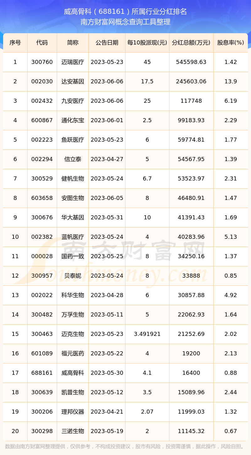 按照南方财富网趋势选股系统统计,威高骨科所属行业为医疗器械行业,医疗器械行业分红排名情况如下表: