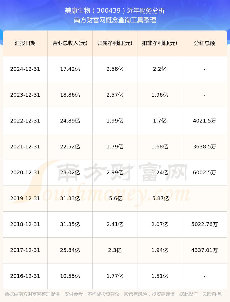 美康生物公司2024年实现营业收入17.42亿元,同比增长-7.61%;净利润2.58亿元,同比增长0.56%;毛利率44.55%。