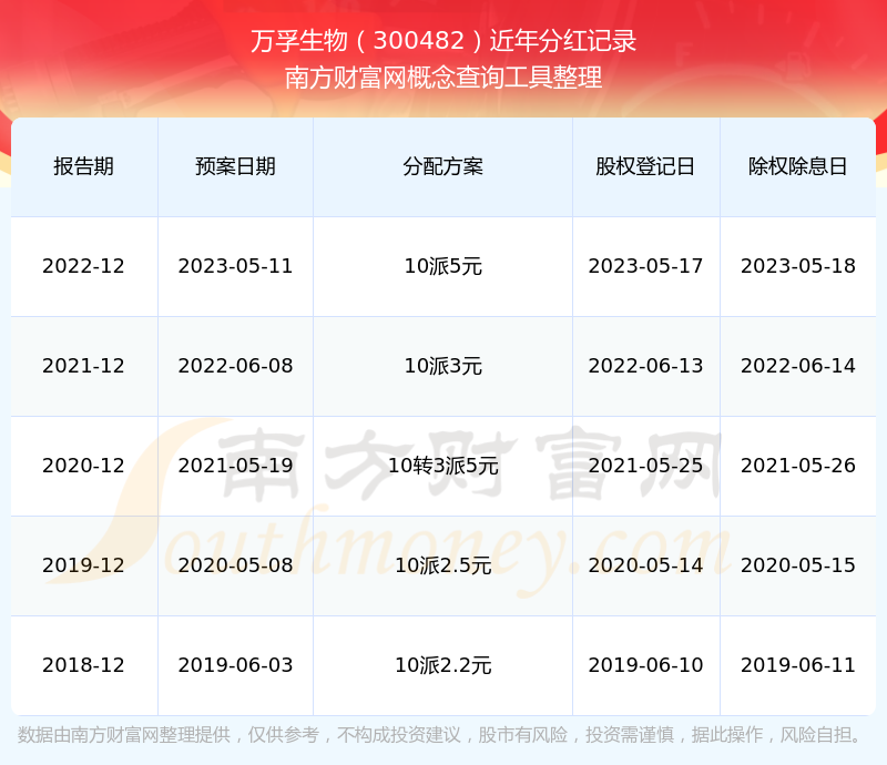 万孚生物最新一次公布的分红方案为10派5元。本次权益分派股权登记日为2023年5月17日,除权除息日为2023年5月18日,派息日为2023年5月18日。