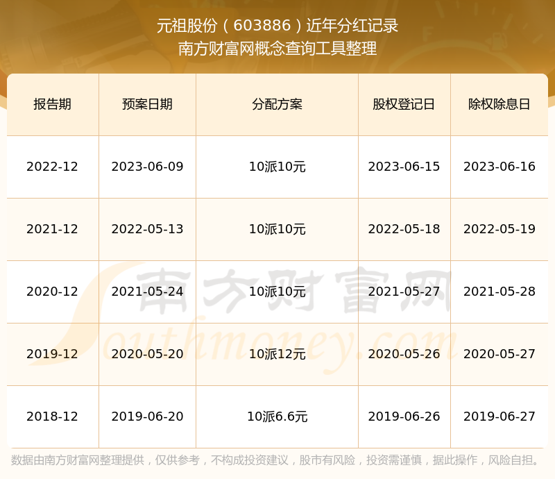 元祖股份最新一次公布的分红方案为10派10元。本次权益分派股权登记日为2023年6月15日,除权除息日为2023年6月16日,派息日为2023年6月16日。