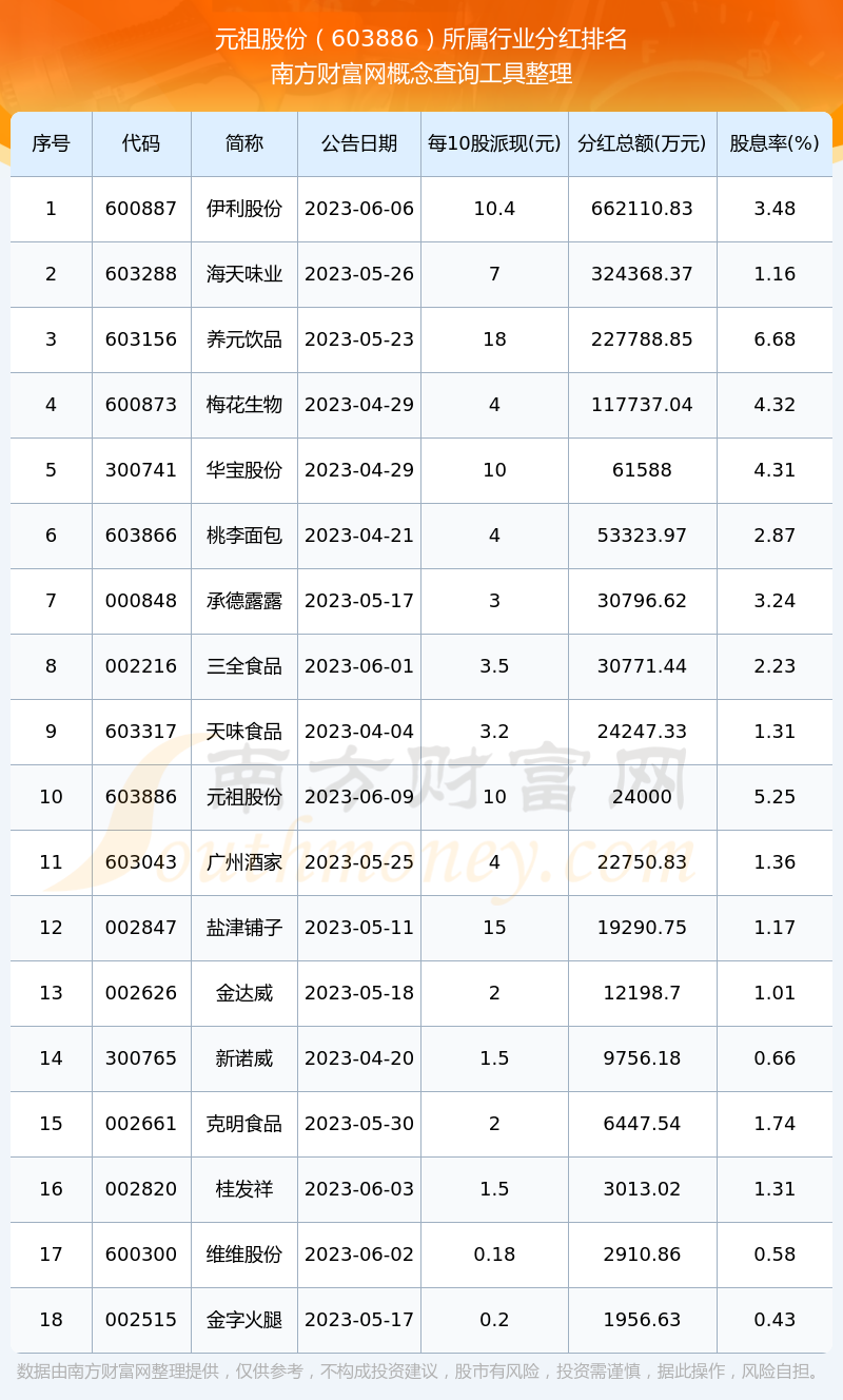 按照南方财富网趋势选股系统统计,元祖股份所属行业为食品饮料行业,食品饮料行业分红排名情况如下表: