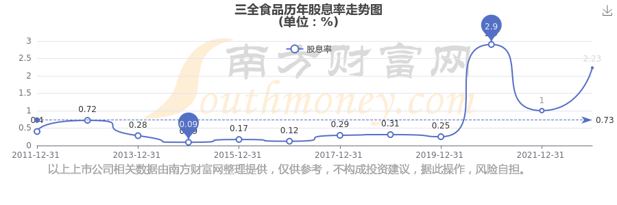 三全食品最新一次公布的分红方案为10派3.5元。本次权益分派股权登记日为2023年6月6日,除权除息日为2023年6月7日,派息日为2023年6月7日。