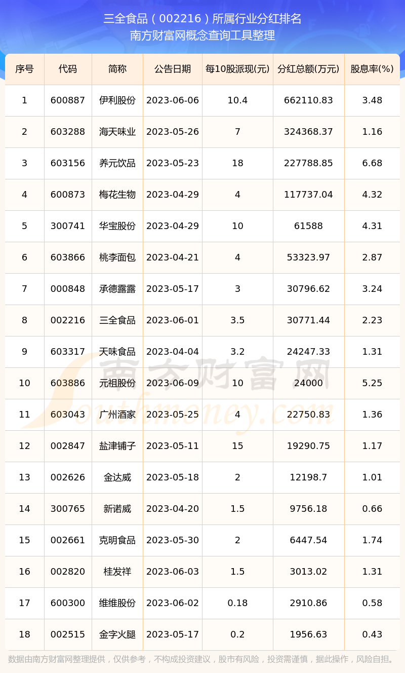 按照南方财富网趋势选股系统统计,三全食品所属行业为食品饮料行业,食品饮料行业分红排名情况如下表: