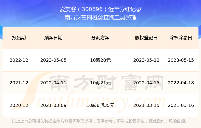 爱美客最新一次公布的分红方案为10派28元。本次权益分派股权登记日为2023年5月12日,除权除息日为2023年5月15日,派息日为2023年5月15日。