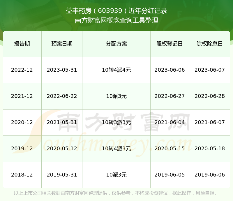 益丰药房最新一次公布的分红方案为10转4派4元。本次权益分派股权登记日为2023年6月6日,除权除息日为2023年6月7日,派息日为2023年6月7日。