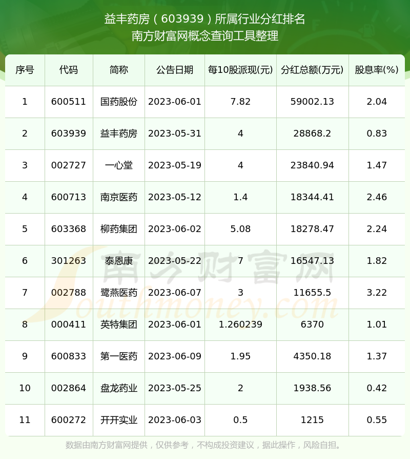 按照南方财富网趋势选股系统统计,益丰药房所属行业为医药商业行业,医药商业行业分红排名情况如下表:
