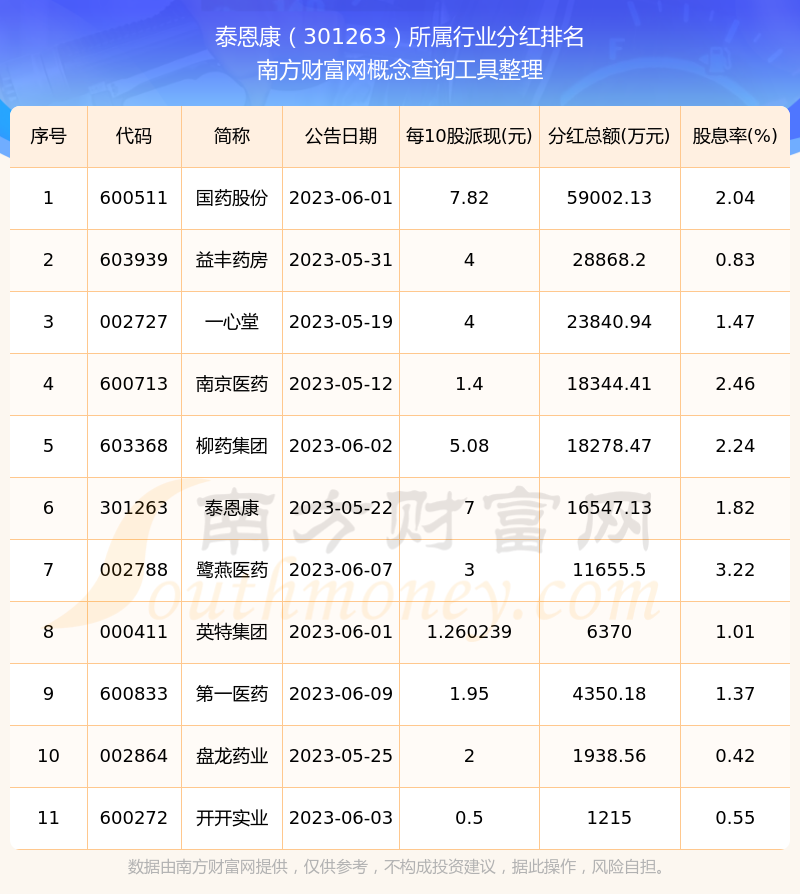 按照南方财富网趋势选股系统统计,泰恩康所属行业为医药商业行业,医药商业行业分红排名情况如下表: