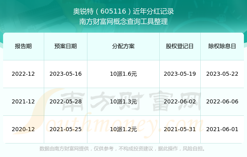 奥锐特最新一次公布的分红方案为10派1.6元。本次权益分派股权登记日为2023年5月19日,除权除息日为2023年5月22日,派息日为2023年5月22日。