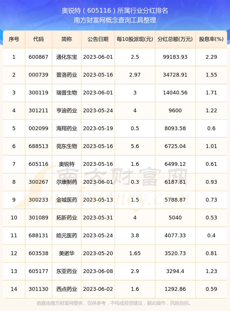 按照南方财富网趋势选股系统统计,奥锐特所属行业为原料药行业,原料药行业分红排名情况如下表: