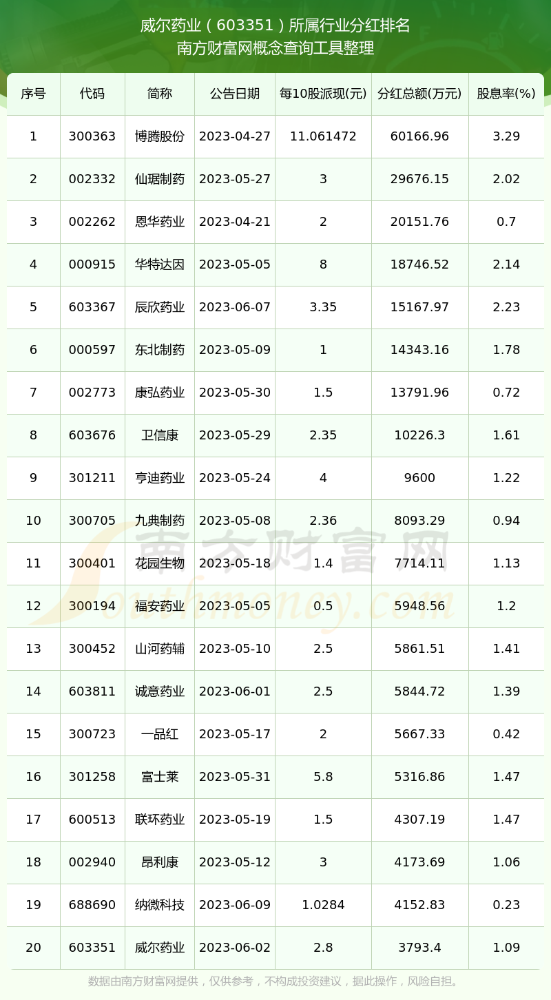 按照南方财富网趋势选股系统统计,威尔药业所属行业为化学制药行业,化学制药行业分红排名情况如下表: