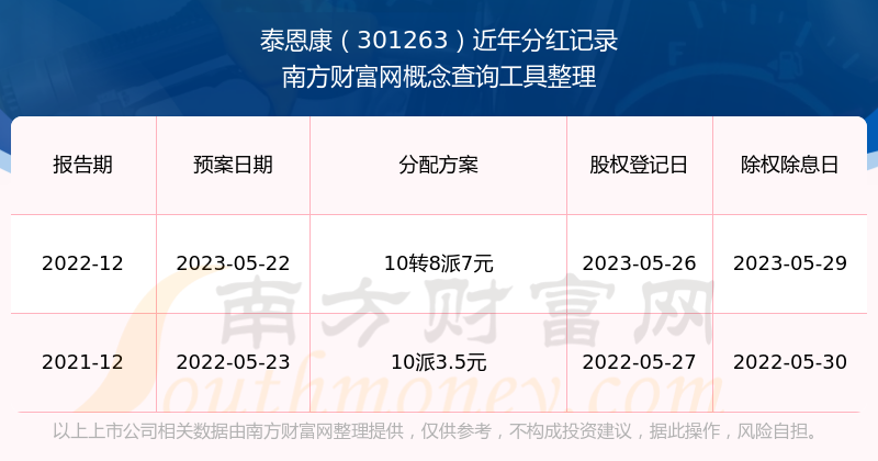 泰恩康最新一次公布的分红方案为10转8派7元。本次权益分派股权登记日为2023年5月26日,除权除息日为2023年5月29日,派息日为2023年5月29日。