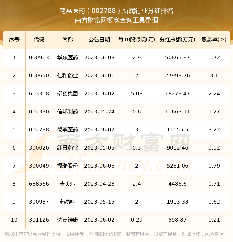按照南方财富网趋势选股系统统计,鹭燕医药所属行业为医药商业行业,医药商业行业分红排名情况如下表: