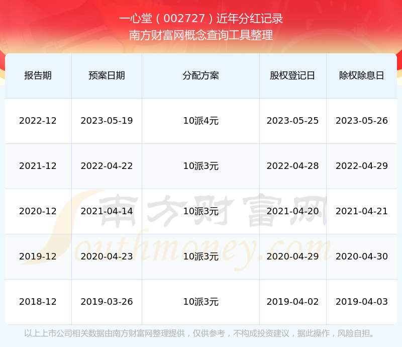 一心堂最新一次公布的分红方案为10派4元。本次权益分派股权登记日为2023年5月25日,除权除息日为2023年5月26日,派息日为2023年5月26日。