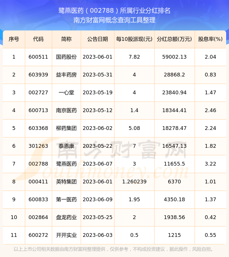 按照南方财富网趋势选股系统统计,鹭燕医药所属行业为医药商业行业,医药商业行业分红排名情况如下表:
