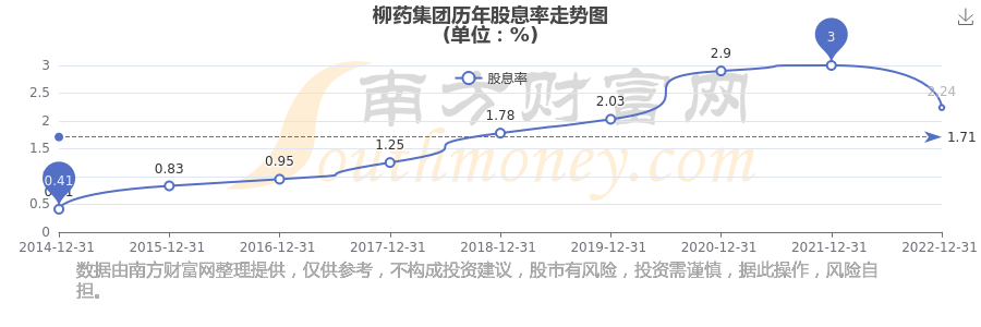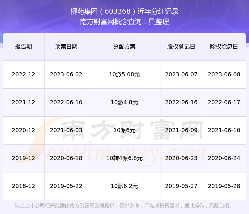 柳药集团最新一次公布的分红方案为10派5.08元。本次权益分派股权登记日为2023年6月7日,除权除息日为2023年6月8日,派息日为2023年6月8日。