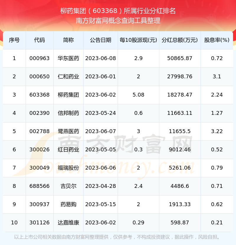 按照南方财富网趋势选股系统统计,柳药集团所属行业为药品行业,药品行业分红排名情况如下表: