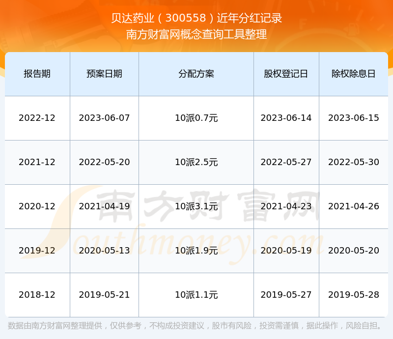 贝达药业最新一次公布的分红方案为10派0.7元。本次权益分派股权登记日为2023年6月14日,除权除息日为2023年6月15日,派息日为2023年6月15日。