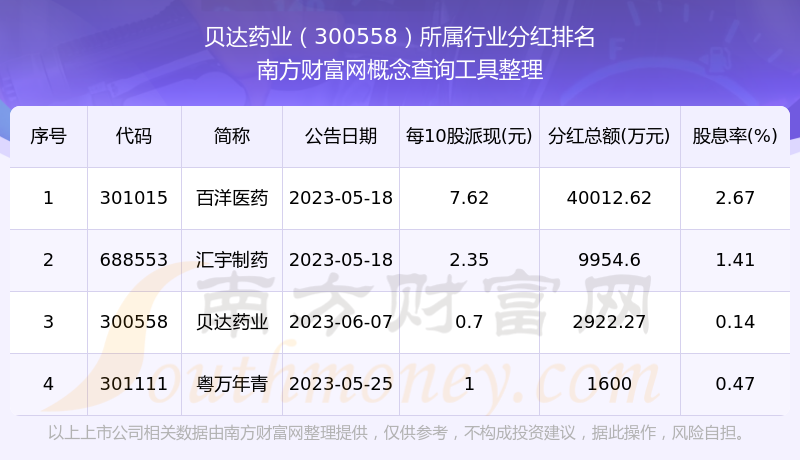 按照南方财富网趋势选股系统统计,贝达药业所属行业为药品销售行业,药品销售行业分红排名情况如下表: