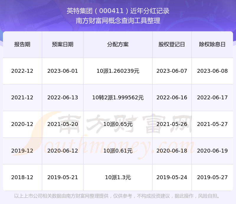 英特集团最新一次公布的分红方案为10派1.260239元。本次权益分派股权登记日为2023年6月7日,除权除息日为2023年6月8日,派息日为2023年6月8日。