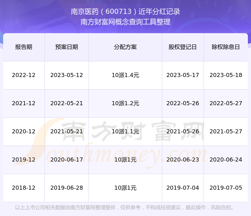 南京医药最新一次公布的分红方案为10派1.4元。本次权益分派股权登记日为2023年5月17日,除权除息日为2023年5月18日,派息日为2023年5月18日。